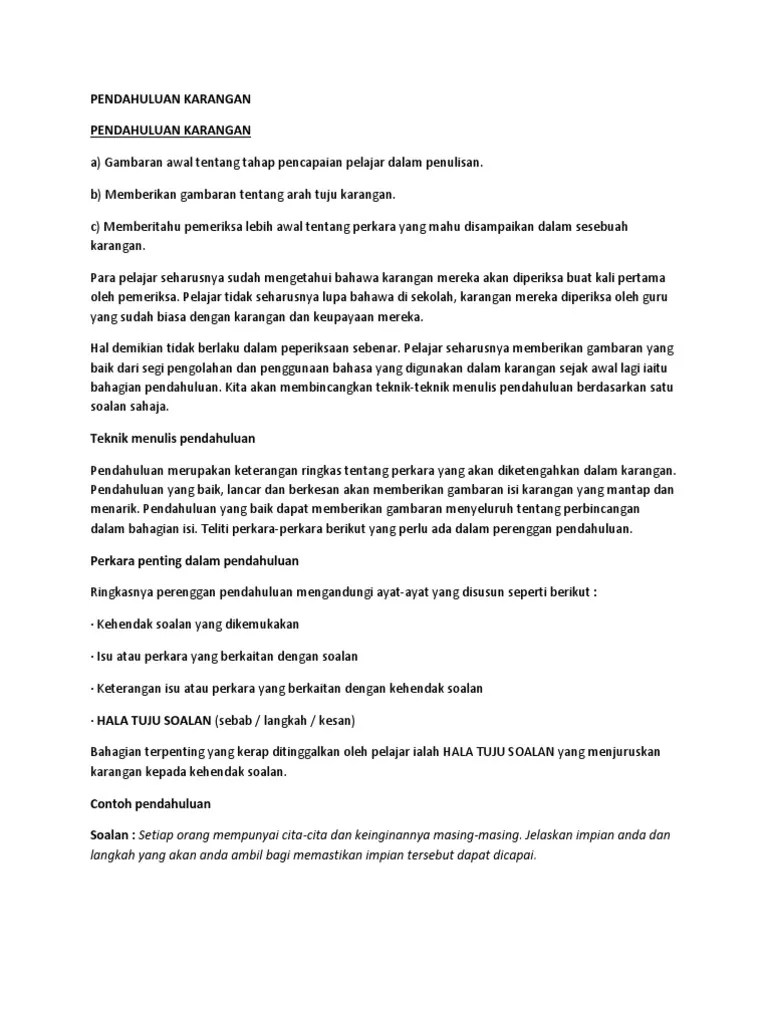 Bagi calon yang akan menduduki peperiksaan sijil pelajaran malaysia spm anda dikehendaki menjawab soalan penulisan karangan bahasa melayu pada bahagian a dan bahagian b kertas 1. Pendahuluan atau pengenalan adalah berfungsi untuk menjelaskan tema karangan. Scribd is the worlds largest social reading and publishing site.